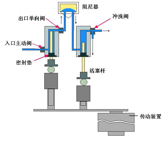 在第一个活塞向上移动时,泵头通过出口球阀把溶剂输入第二个泵单元。第二个活塞吸入第一个活塞排出体积的一半(2:1),另外一半直接输送到系统。在第一个活塞的向下移动的过程中,第二个活塞就把抽取的剩下的一半溶剂输送到系统中。这样两个活塞互补的配合工作实现了液体的连续输出,满足了液相色谱仪分析的要求。两个活塞泵单元在一起被称为一个泵(头)。