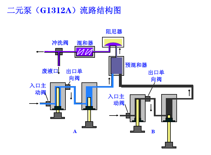 流动相从溶剂瓶流入入口主动阀,第一个泵单元的入口与入口主动阀相连,该入口主动阀的启闭受处理器的控制,从而允许溶剂被吸入第一个活塞泵单元。第一个活塞泵单元的出口通过出口球阀和阻尼器与第二个活塞泵单元的入口相连。冲洗阀组件的出口连接到下一个色谱系统。