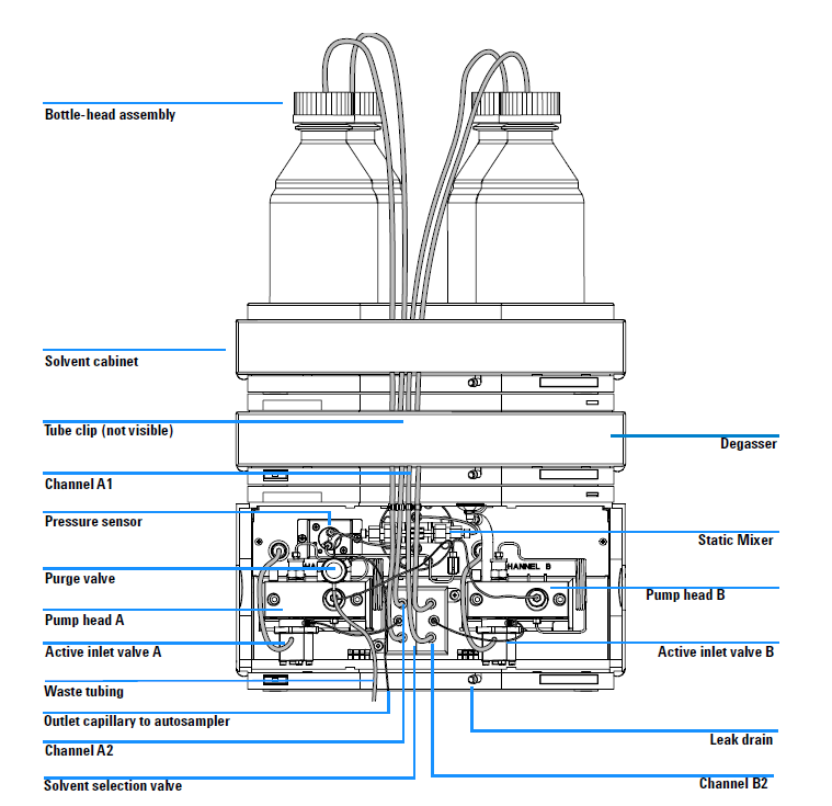 二元泵又分为:无溶剂选择阀(两通道)和有溶剂选择阀(四通道)这两种情况,具体可以参见以下两张图。虽然配有溶剂选择阀的泵有四个通道(A1,A2,B1,B2)但最多也只能同时使用两个通道且不能是相同属性的通道。