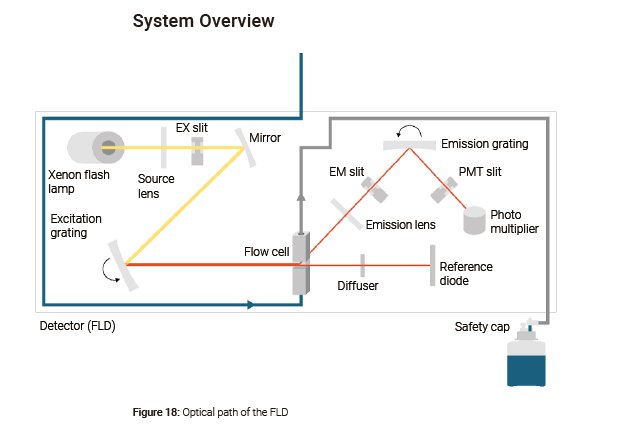 用原理图,我们再来理解荧光检测器的工作原理。氙灯发光通过聚光透镜将光线聚集并穿过EX狭缝,并通过反射镜照射到EX光栅,此时的光线由很宽的带宽,到光栅后,光栅旋转,光栅的位置决定了激发光的波长。被选定波长后的激发光照射流通池,透过流通池的激发光到达参比二极管。流通池内的样品被激发光照射后产生荧光,在流通池内被反射至EM光栅。经过发射光栅,选择特定波长的发射光又经光电倍增管的增强后,得到最终我们看到的信号。