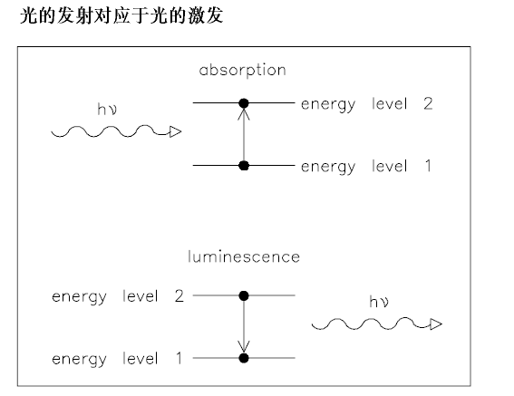 基本来说,光的发射是吸收的反过程。当比较复杂的分子从基态到激发态,吸收的能量分布到各个振动和转动能级,此时这个分子回到基态,首先失去振动和转动能成为弛豫状态,不产生辐射。然后,这个分子从这一能级转换到基态的各个振动和转动能级,有光辐射出现。如图,一个物质的最大吸