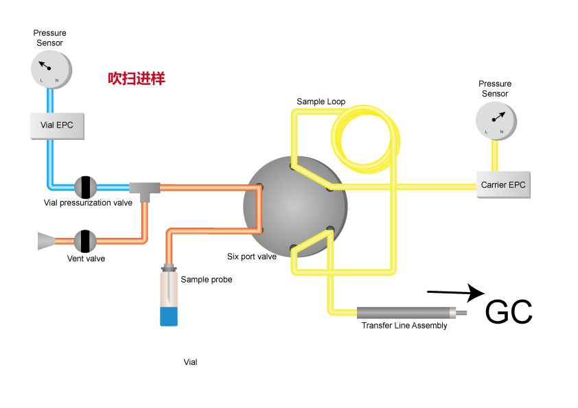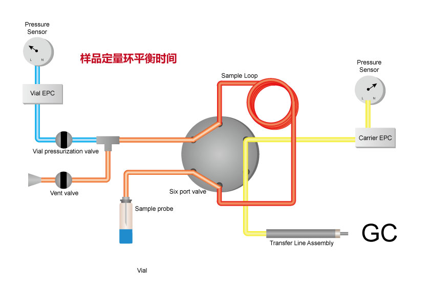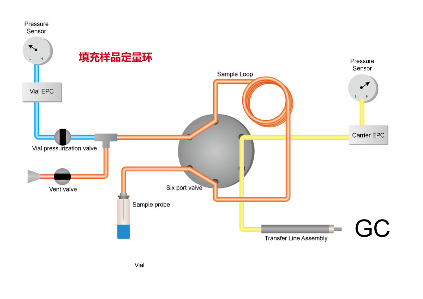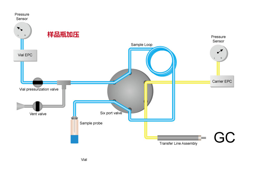 取样针刺穿样品隔垫,样品环的容量即是进入到气相系统的顶空体积,通常为1或者3毫升,当需要将样品加入到样品环时,加压阀打开,放入加压气体,然