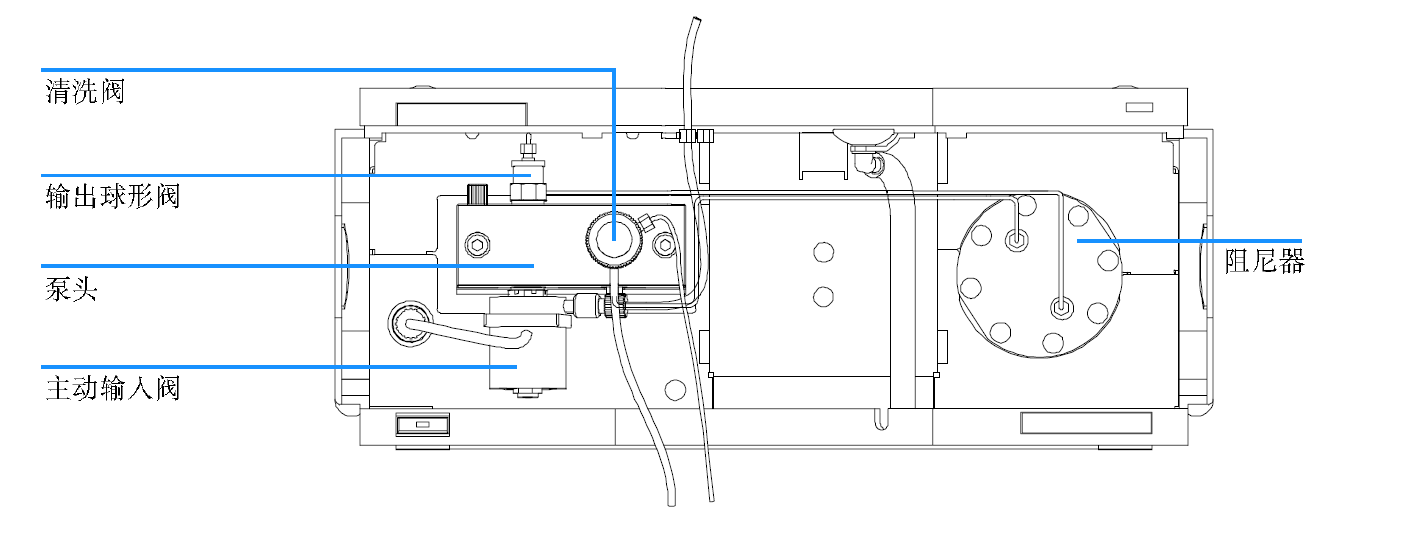 流动相从溶剂瓶流入入口主动阀,第一个泵单元的入口与入口主动阀相连,该入口主动阀的启闭受处理器的控制,从而允许溶剂被吸入第一个活塞泵单元。第一个活塞泵单元的出口通过出口球阀和阻尼器与第二个活塞泵单元的入口相连。冲洗阀组件的出口连接到下一个色谱系统。