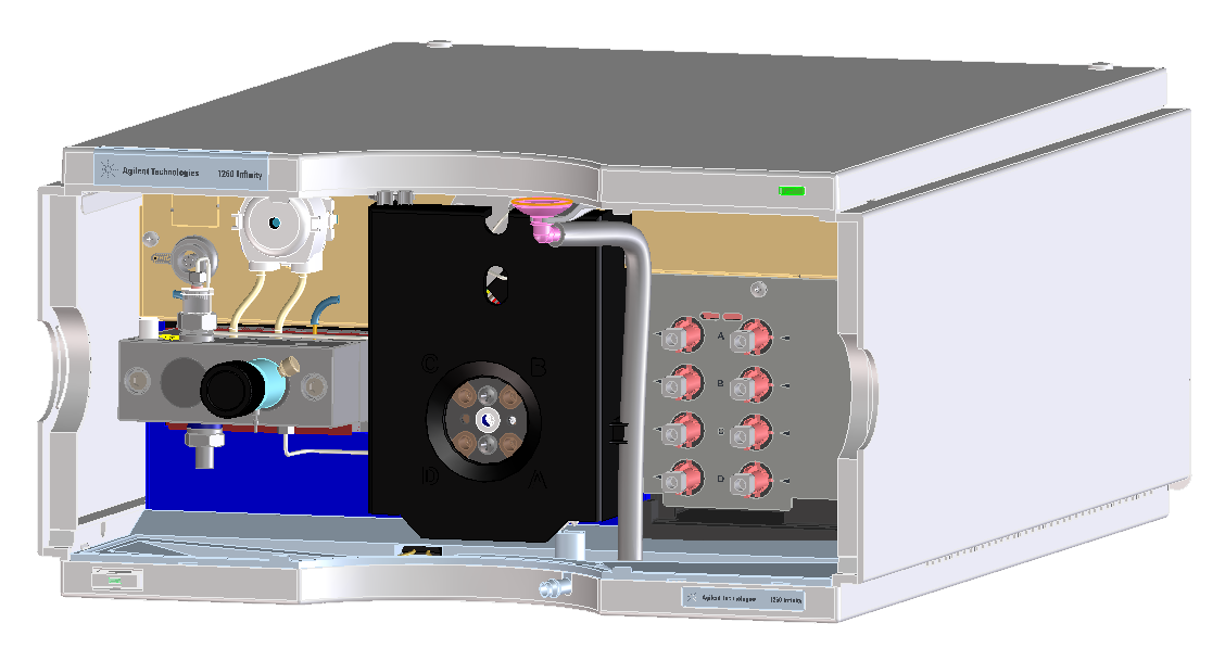四元泵包括一个真空脱气机和一个四通道梯度泵。四通道的梯度泵包括一个高速配量阀(也称为:多通道梯度阀,英文为MCGV,也就是我们通常说的比例阀)和一个泵组件。这里需要注意的是:四元泵是通过泵前低压混合来产生梯度,脱气是低压梯度系统必需的,因此 Agilent 1260 系列的真空脱气机是四元泵系统的一部分。