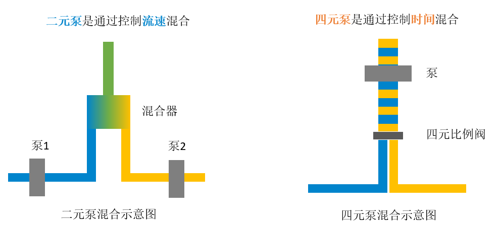 就直观来讲,二元泵是两通道混合,四元泵是四通道混合,那么大家是否会觉得,四元泵优于二元泵呢?我们具体来看一看。