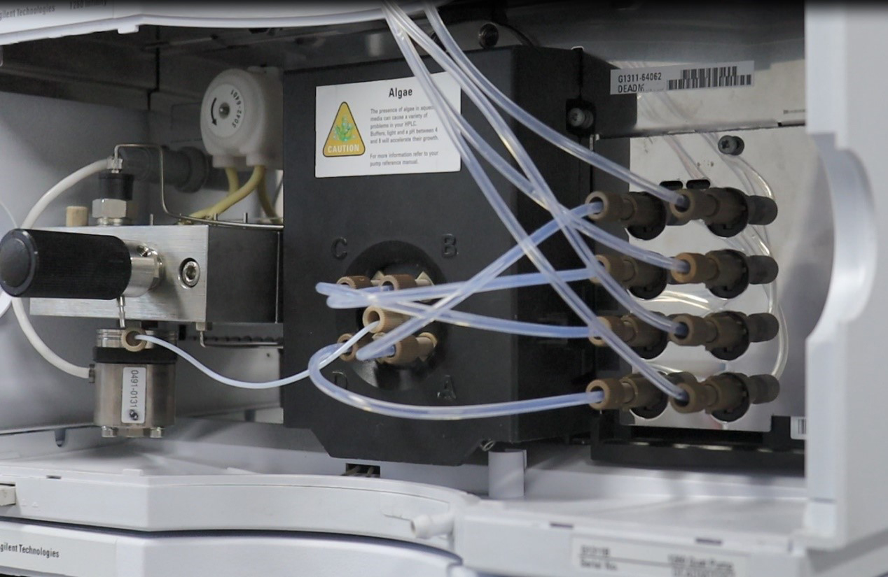 首先观察溶剂过滤头至比例阀之间的管线是否有大量气泡存在,如有可将四元比例阀处管线PEEK接头拧松排出气泡或者用注射器将气泡缓慢抽出。如果无效,依次检查溶剂过滤头脱气机管路等是否有堵塞。
