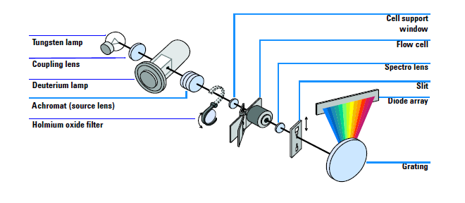 DAD检测器的紫外光由氘弧放电灯得到,可见光和近红外光由钨灯得到。采用特殊的后置灯设计,借助耦合透镜使钨灯灯丝影像正好聚焦到氘灯的放电孔处,这便很好的将两个光源结合到一起,使他们放出的光共用同一个光轴进入光源透镜,光线经消色差透镜(光源透镜)后形成一束单色聚焦光进入流通池,每个流通室与光源灯都用石英窗隔开,这样便于清洗和更换。在摄谱仪中,通过全息光栅把光线分散到二极管陈列上,从而可同时得到所有波长的信息。