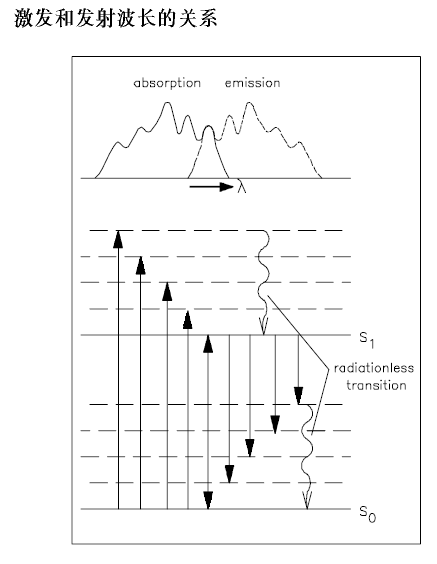 基本来说,光的发射是吸收的反过程。当比较复杂的分子从基态到激发态,吸收的能量分布到各个振动和转动能级,此时这个分子回到基态,首先失去振动和转动能成为弛豫状态,不产生辐射。然后,这个分子从这一能级转换到基态的各个振动和转动能级,有光辐射出现。如图,一个物质的最大吸