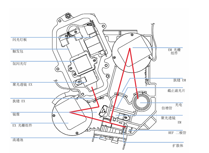 如上图,可以观察到荧光检测器光学系统的所有元件,其辐射源为氙灯,此灯以3μs的闪烁频率发出200nm-900nm的连续光谱。当上盖被打开时,可以感受到此灯非常烫,一定要小心。光栅利用三相无刷直流电机转动,决定了光落到流通池上的波长范围。光栅的表面有许多微小的凹槽,每毫米有1200个凹槽,千万不要用手直接接触。流通池是由固体熔融石英体做成,可承受最大20bar的背压,这个石英流通池非常脆弱,所以不建议用大流速或高粘度的流动相冲洗它。在流通池后面有一个参比二极管,它用来测量穿过流通池的激发光并校正闪光灯的波动和强度造成的漂移。