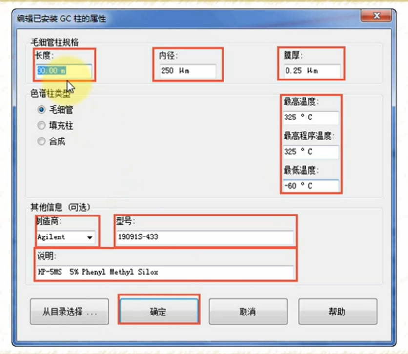 仪器➡设置Agilent 7890A 参数设置➡配置➡色谱柱,便可以进行色谱柱配置。如果是安捷伦的色谱组,可通过目录选择色谱柱的类型,如果是其他品牌的色谱柱,需要将相关长度、内径、膜厚等信息自行填入,并添加至常用色谱柱,以便下次更换时可直接选取。