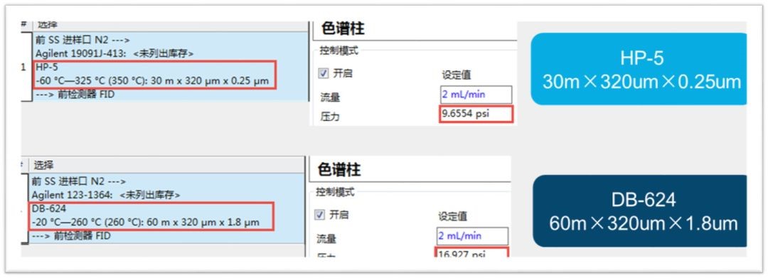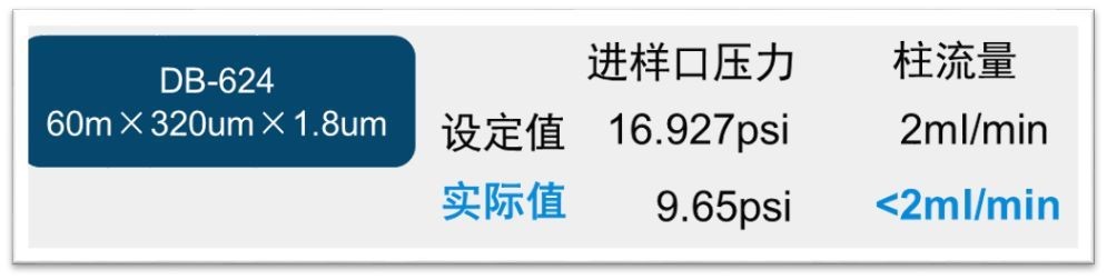 例如HP-5(30m×320um×0.25um)与DB-624(60m×320um×1.8um)这两款色谱柱,当柱流量均设置为2mL/min时,HP-5需要的柱头压为9.65psi,而DB-624需要的柱头压为16.93psi,若将HP-5更换为DB-624,却未在软件中进行配置,会发生什么呢?